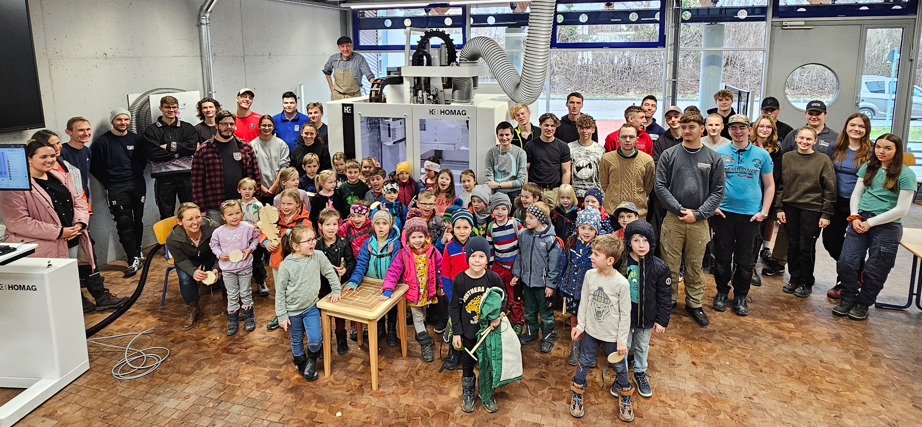 Die Schülerinnen und Schüler schlüpften in die Rolle des Lehrers und fertigten mit den Kindern verschiedene Spielzeuge. Ob bei der Fertigung einer "Hui hui Maschine", dem Schleifen von Bauklötzen oder dem Fräsen von Pumuckl- Gravuren und Pumuckl-Schildern mit der neuen CNC-Fräse - bei allem arbeiteten die kleinen Nachwuchskräfte begeistert und eifrig mit.