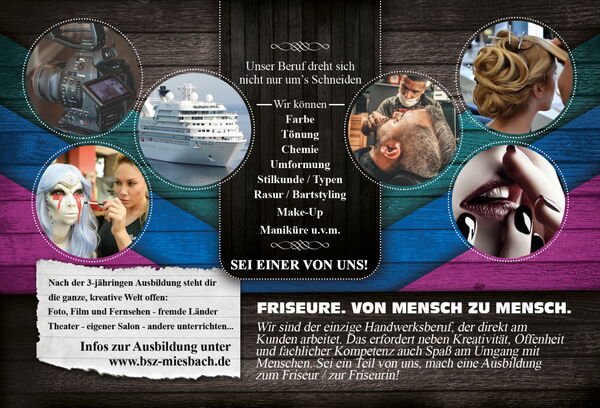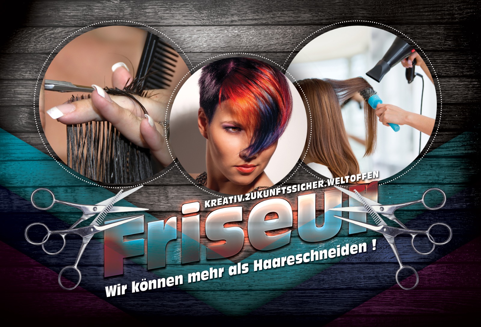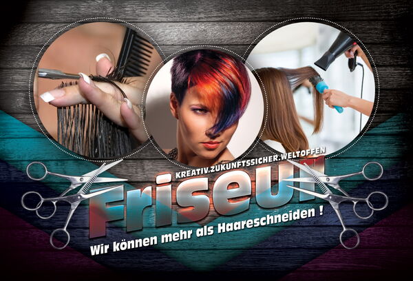 Sie waschen, pflegen, schneiden, färben und frisieren Haare. Sie beraten Kunden individuell in Fragen der Frisur, der Haarpflege und des Haarstylings, pflegen Hände, gestalten Fingernägel sowie Make-up und verkaufen kosmetische und Haarpflegeartikel. Nach der Ausbildung zur Friseur/in können sie sich zur Friseurmeister/in weiterbilden. Die duale Ausbildung dauert drei Jahre. Dabei findet Vollzeitunterricht an der Berufsschule in Theorie und Praxis ein Tag pro Woche statt. Ausbildung im Betrieb: vier Tage pro Woche.
